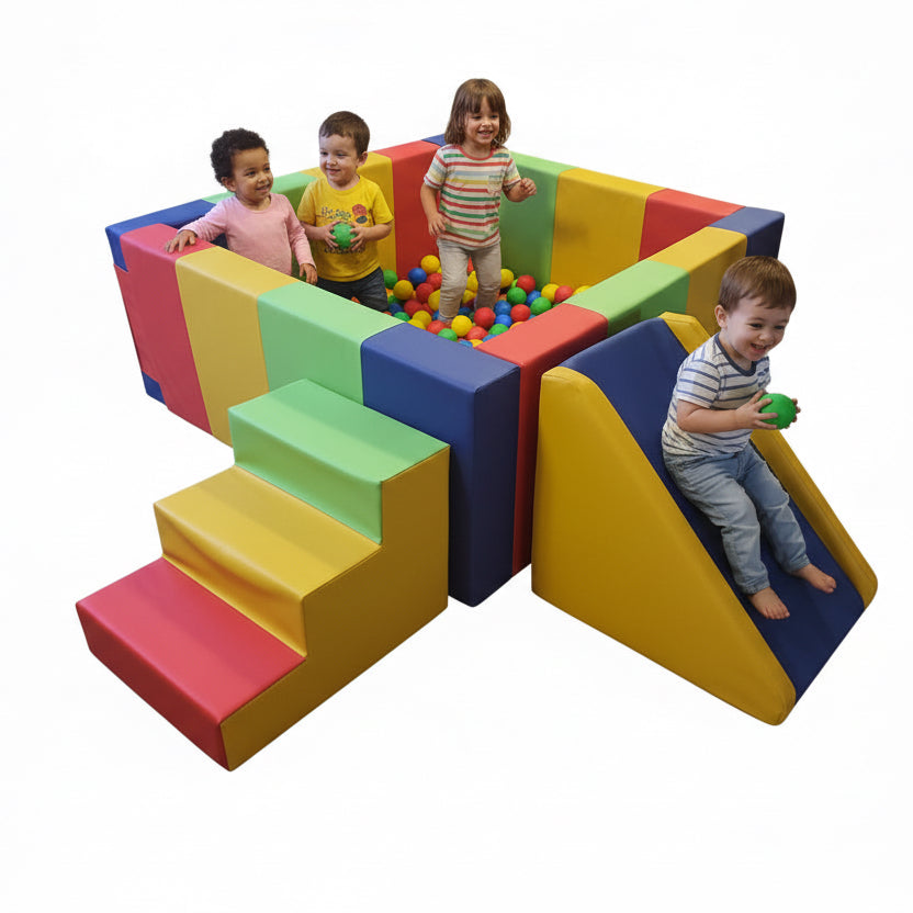 El Pack Aventura incluye una piscina de pelotas, diseñada para fomentar el desarrollo motor y la coordinación en niños. Este espacio de juego seguro y divertido estimula la actividad física, promoviendo el ejercicio y la interacción social, aspectos vitales en la infancia. Ideal para uso en interiores y exteriores.